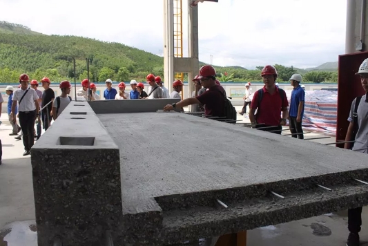 深汕特別合作區盛騰科技工業園黨支部書記、總經理韓良君帶領大家深度考察了園內的PC構件生產線,預制凸窗、預制樓梯、預制梯井隔墻、預應力雙T墻板吊裝過程等。頻頻亮點、創新引領,令會員代表們紛紛豎起了大拇指,并由衷地感嘆盛騰人的大膽創新與勤懇務實。