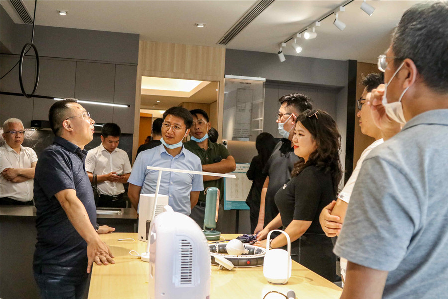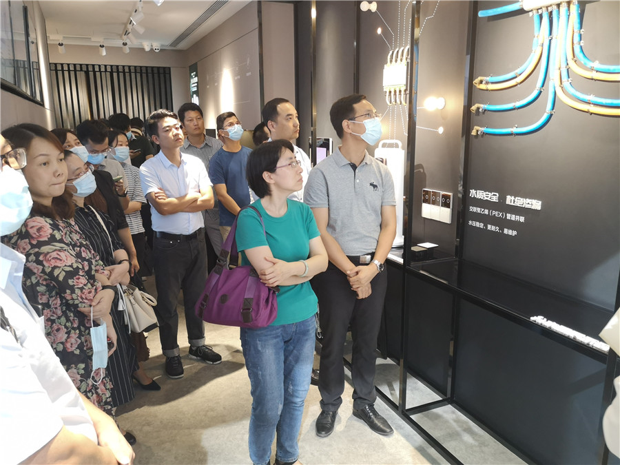 考察人員一行參觀了華筑裝配式智慧展廳。據了解,該展廳采用自主研發的裝配式體系實現全干法作業,裝修全過程不需要一滴清水,具有施工周期快、節能環保、易維護等優勢。現場可以看到展廳展出內容豐富、亮點突出,考察人員一一觀看了展出的裝配式天花、墻體、地坪、水電、廚衛、門窗、連接、智能化、收納等九大系統和上百種裝配化部件,詳細了解相關系統和部件的突出優勢、技術要點及創新做法。