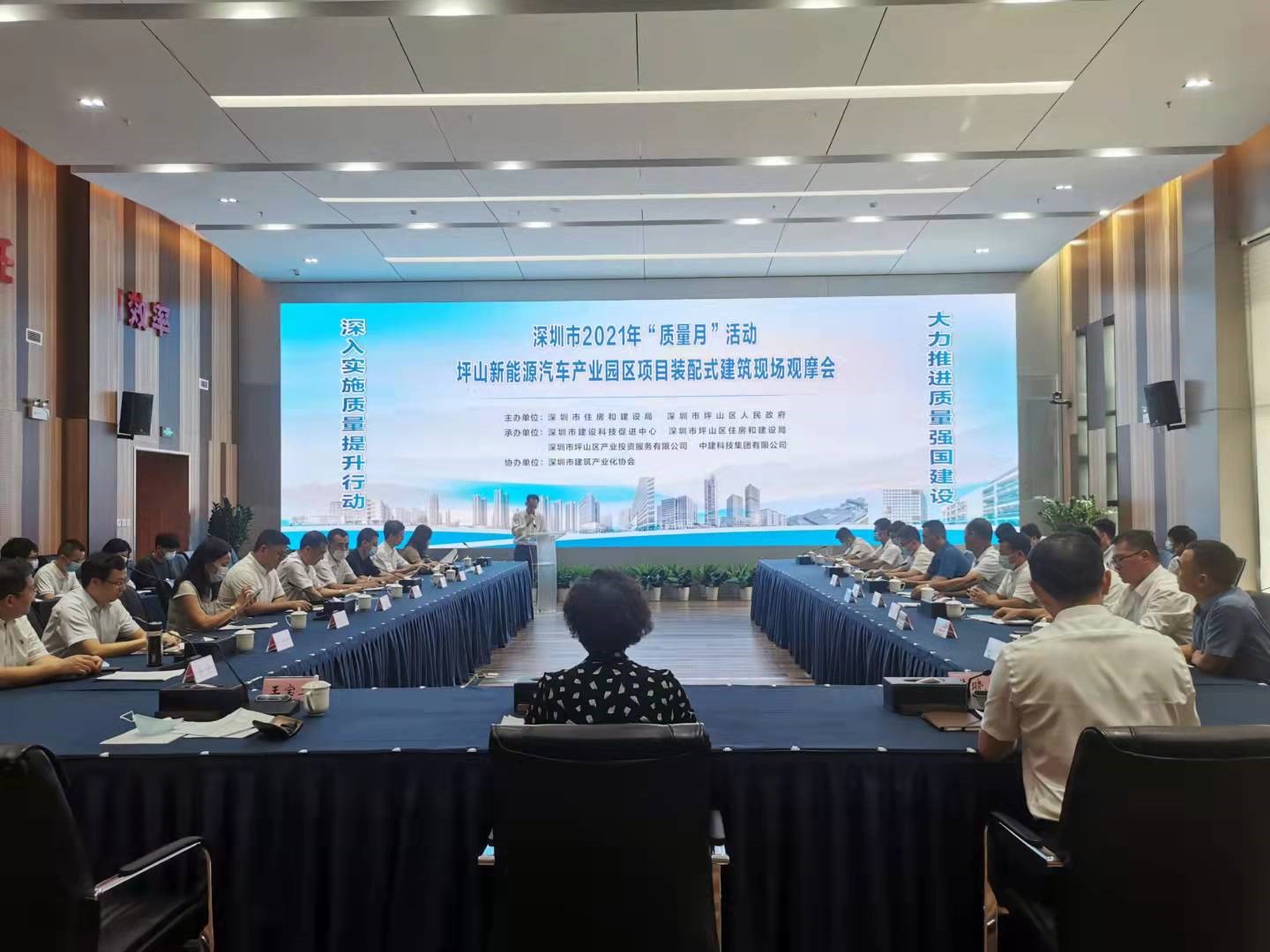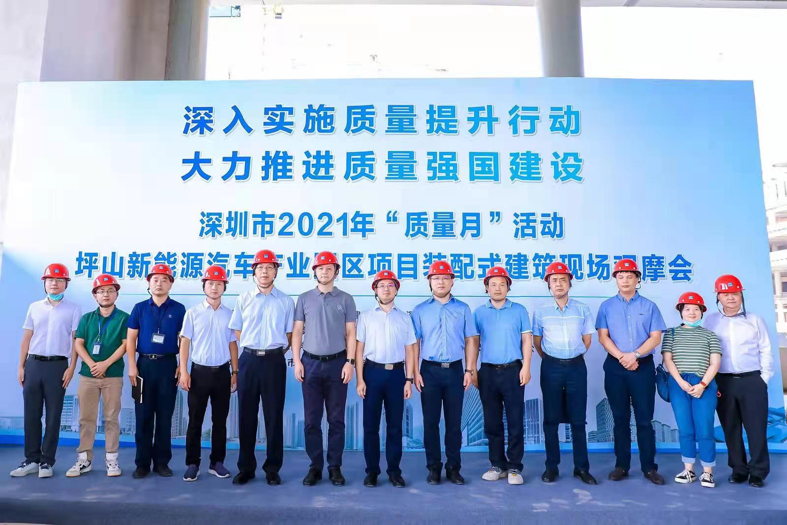 9月26日,由深圳市住房和建設局、深圳市坪山區人民政府主辦,深圳市坪山區產業投資服務有限公司、深圳市建設科技促進中心、深圳市坪山區住房和建設局、中建科技集團有限公司承辦,深圳市建筑產業化協會協辦的深圳市2021年“質量月”裝配式建筑現場觀摩活動在坪山新能源汽車產業園區順利舉辦。坪山區人民政府副區長葉青云、深圳市住房和建設局副局長薛峰出席觀摩活動啟動儀式并致辭。活動采用現場分批觀摩和網絡直播相結合的方式,市、區相關部門代表,開發、設計、施工、監理、生產等企業負責人,以及相關建設行業協會代表等近400人分批次進行現場觀摩。截至當晚20:00,線上觀摩人數已超2萬人次。