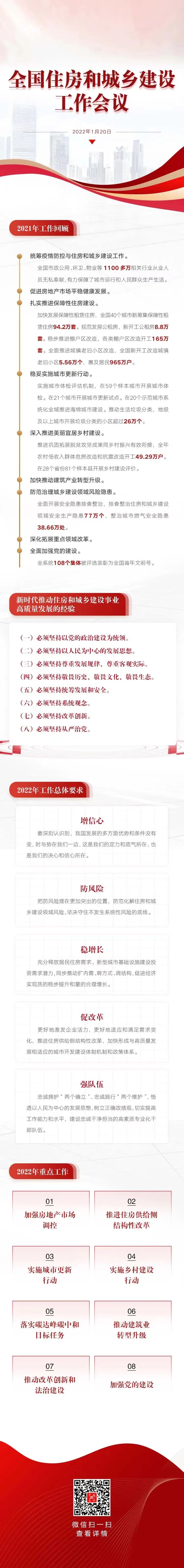 會議強調,2022年,全系統要認真貫徹落實黨中央、國務院決策部署,堅持穩中求進工作總基調,完整、準確、全面貫徹新發展理念,著力在“增信心、防風險、穩增長、促改革、強隊伍”上下功夫。一是增信心。要深刻認識到,我國發展的多方面優勢和條件沒有變,時與勢在我們一邊,這是我們的定力和底氣所在,也是我們的決心和信心所在。二是防風險。把防風險擺在更加突出的位置,防范化解住房和城鄉建設領域風險,堅決守住不發生系統性風險的底線。三是穩增長。充分釋放居民住房需求、新型城市基礎設施建設投資需求潛力,同步推動擴內需、轉方式、調結構,促進經濟實現質的穩步提升和量的合理增長。四是促改革。更好地激發企業活力,更好地適應和滿足需求變化,推進住房供給側結構性改革,加快形成與高質量發展相適應的城市開發建設體制機制和政策體系。五是強隊伍。忠誠擁護“兩個確立”、忠誠踐行“兩個維護”,悟透以人民為中心的發展思想,樹立正確政績觀,切實提高工作能力和水平,建設忠誠干凈擔當的高素質專業化干部隊伍。