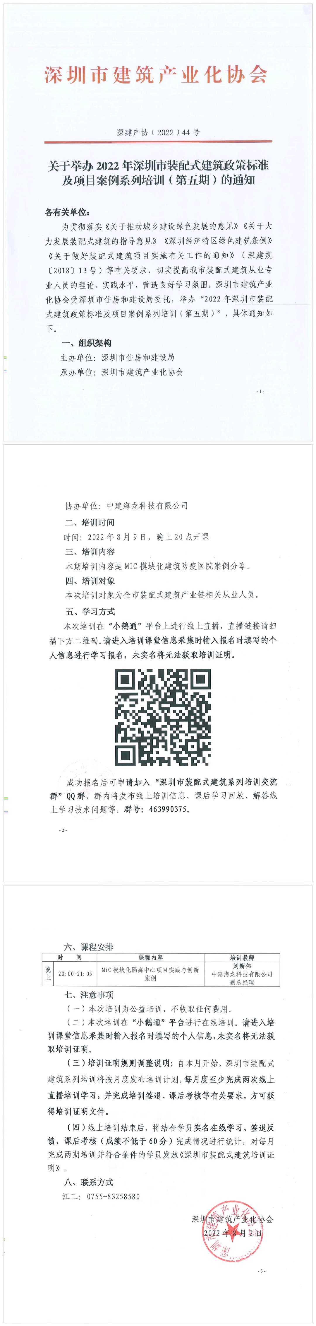 關于舉辦2022年深圳市裝配式建筑政策標準及項目案例系列培訓(第五期)的通知