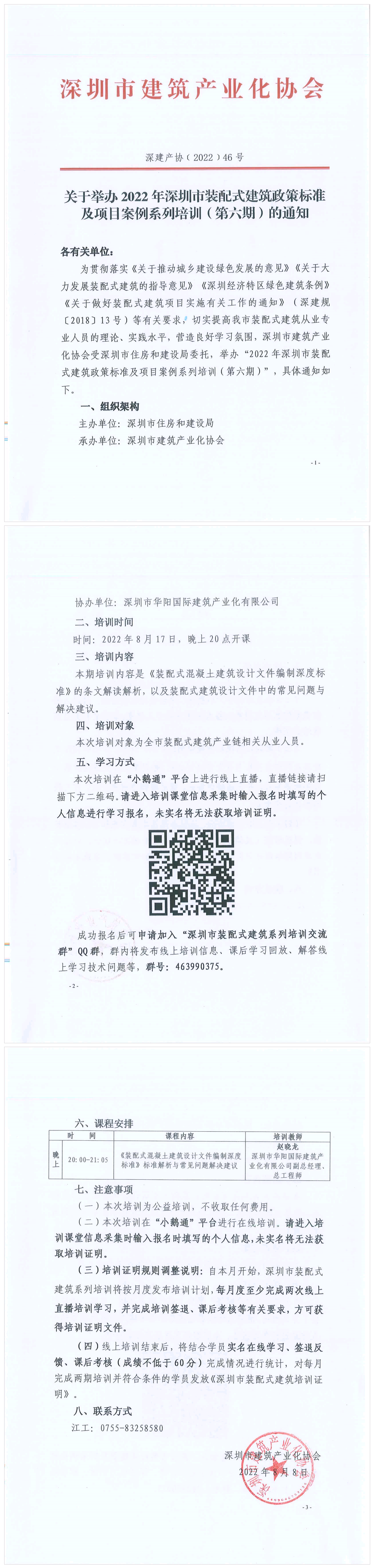 關于舉辦2022年深圳市裝配式建筑政策標準及項目案例系列培訓(第六期)的通知