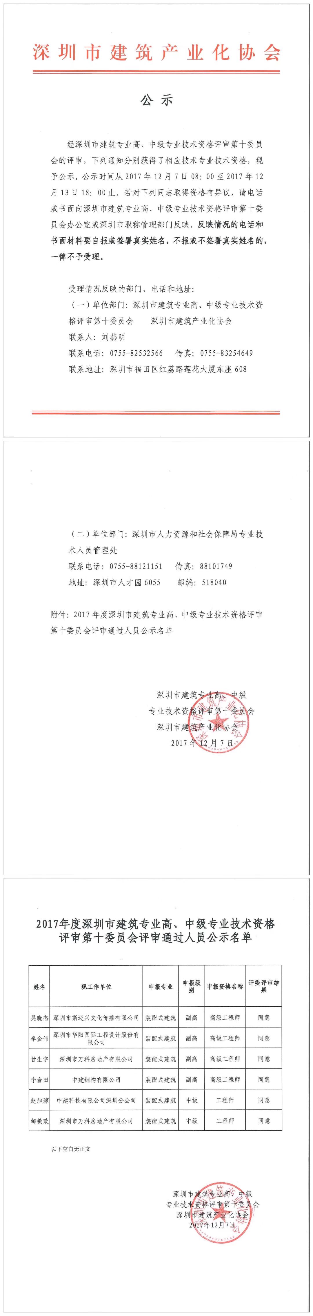 2017年深圳市建筑專業高、中級專業技術資格評審第十委員會裝配式建筑高、中級工程師評審通過人員名單公示