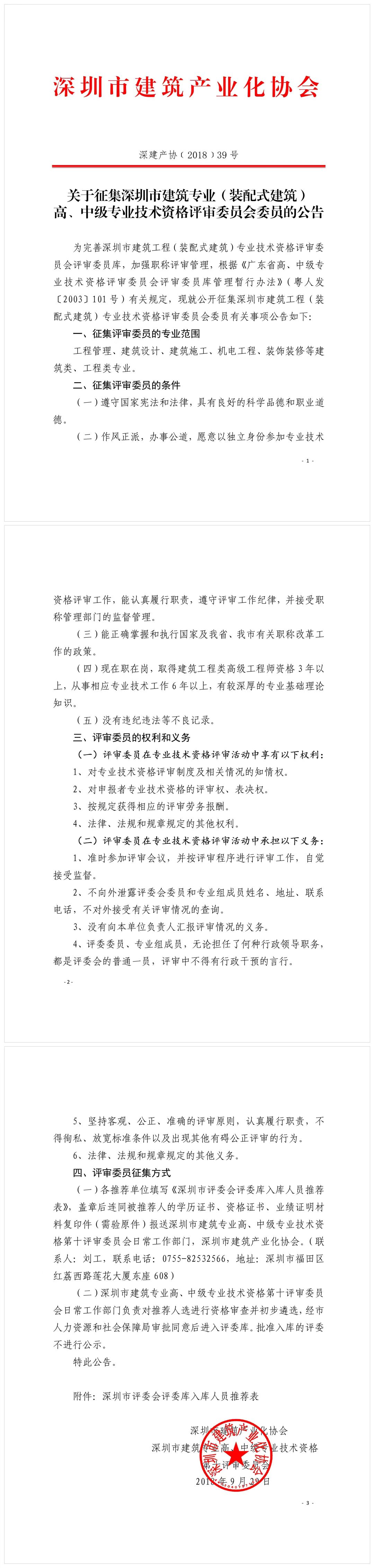 關于征集深圳市建筑專業(裝配式建筑)高、中級專業技術資格評審委員會的公告