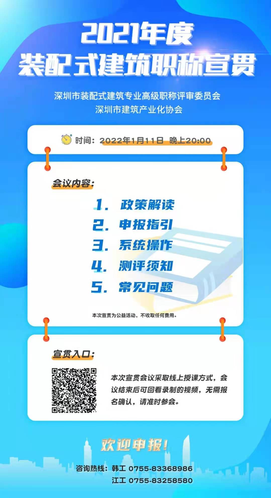 深圳市于2017年成功創建全國首個裝配式建筑專業技術資格,填補了全國裝配式建筑人才評價與培育機制的空白,是我市深化職稱改革工作的重大成果,為裝配式建筑奠定了可持續發展的重要基礎。根據《廣東省人力資源和社會保障廳 廣東省住房和城鄉建設廳關于印發<廣東省建筑工程技術人才職稱評價改革實施方案>的通知》(粵人社規〔2019〕33號)和深圳市人力資源和社會保障局《關于開展深圳市2021年度職稱評審工作的通知》(深人社發〔2021〕50號)精神,為更好推動2021年裝配式建筑專業技術資格評審相關工作,協助各有關單位及個人做好申報工作,保證各有關單位及各申報人完成好2021年度高級職稱評審的申報工作。經深圳市建筑產業化協會及深圳市裝配式建筑專業高級職稱評審委員會研究,決定于2022年1月11日(星期二)晚上20:00召開2021年度裝配式建筑專業技術資格(職稱)宣貫會議。