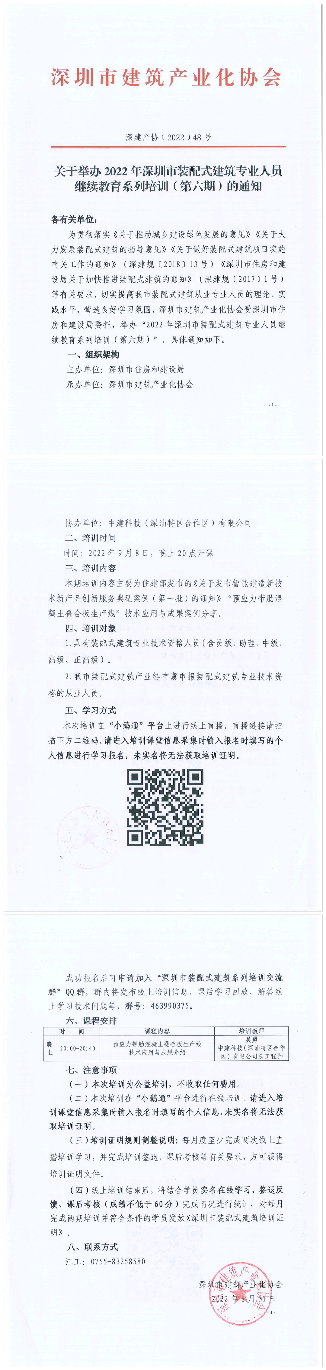 關于舉辦2022年深圳市裝配式建筑專業人員繼續教育系列培訓(第六期)的通知