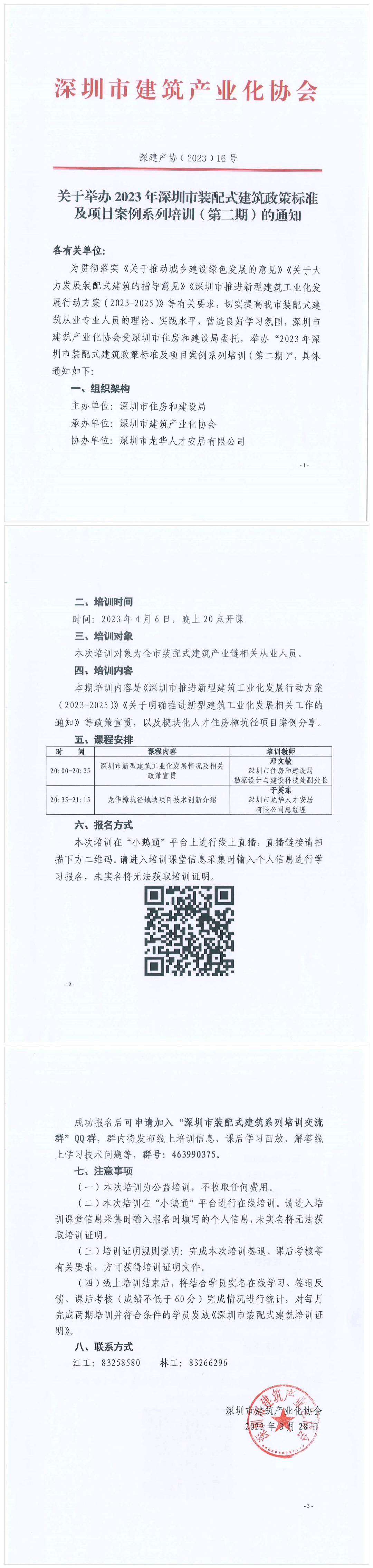 關于舉辦2023 年深圳市裝配式建筑政策標準及項目案例系列培訓(第二期)的通知