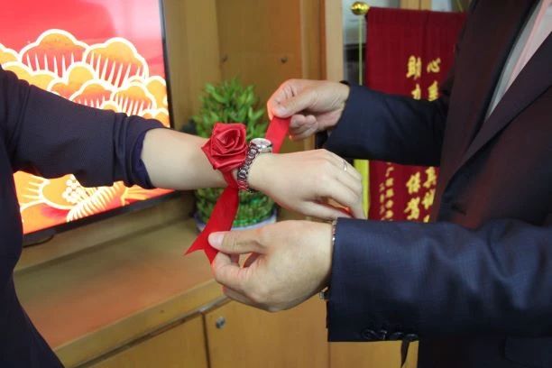 ▲黨委領(lǐng)導(dǎo)為新當(dāng)選婦委會(huì)委員系上紅玫瑰紐帶