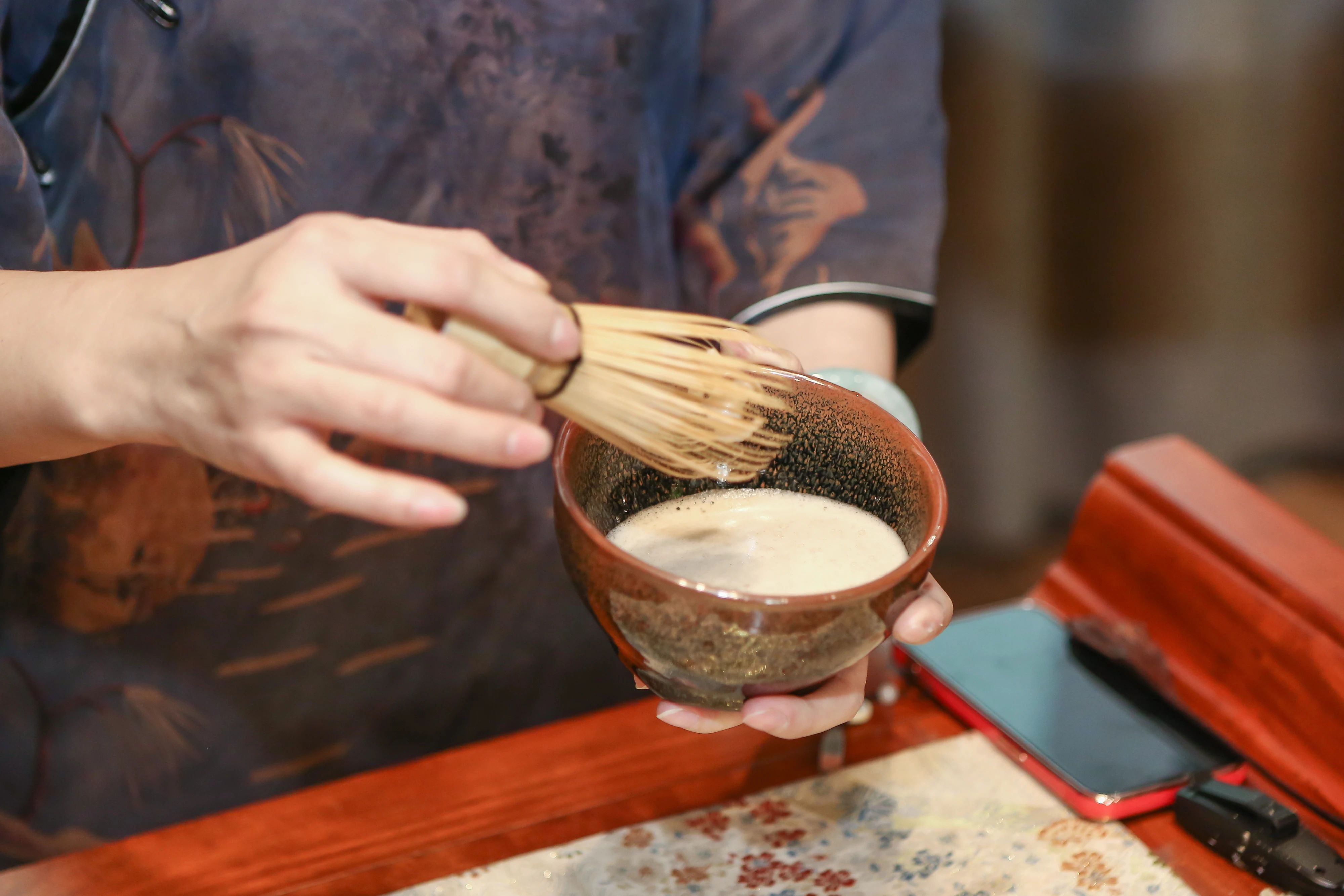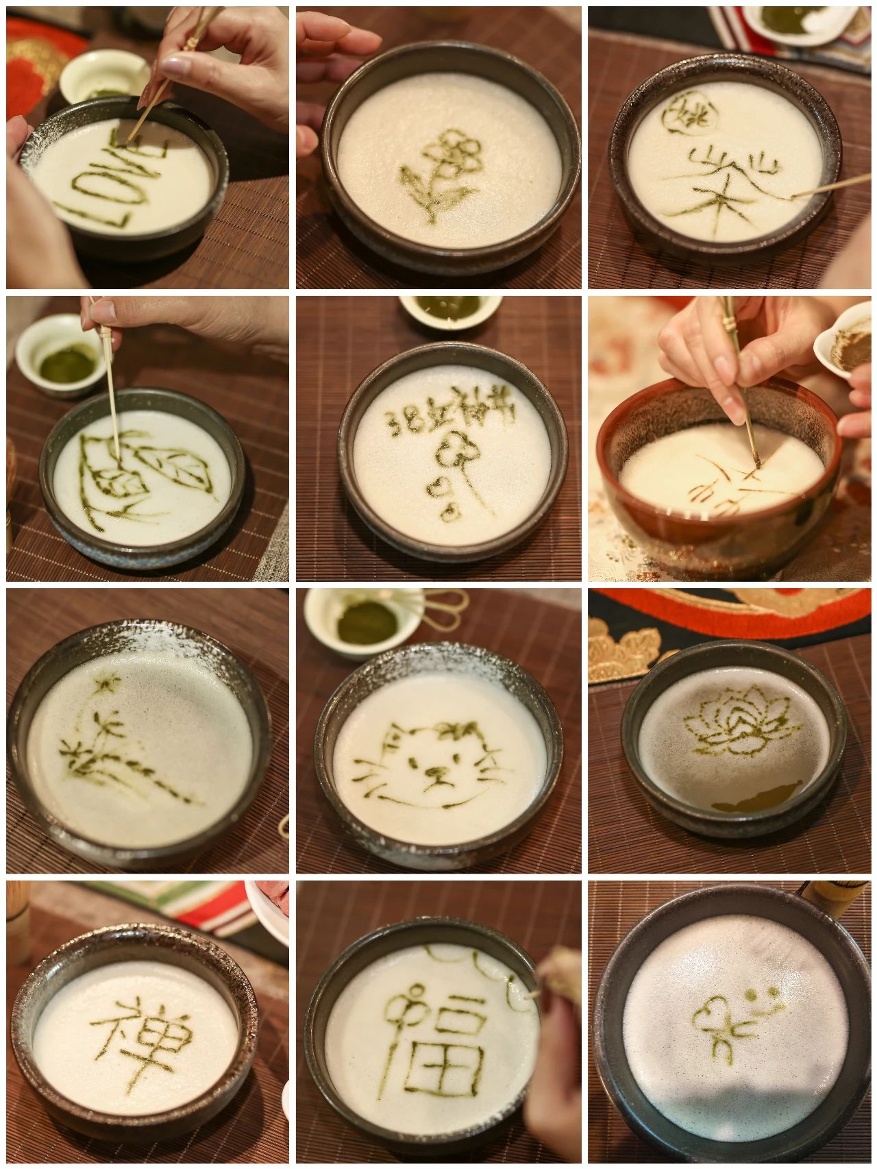 大家跟隨著茶藝老師的教學“點茶”實操,輕攏慢捻轉動茶筅,擊拂數次后,茶泡純白,以茶湯為紙、以茶匙為筆,繪以花鳥魚蟲或書法,充分體驗點茶的樂趣。