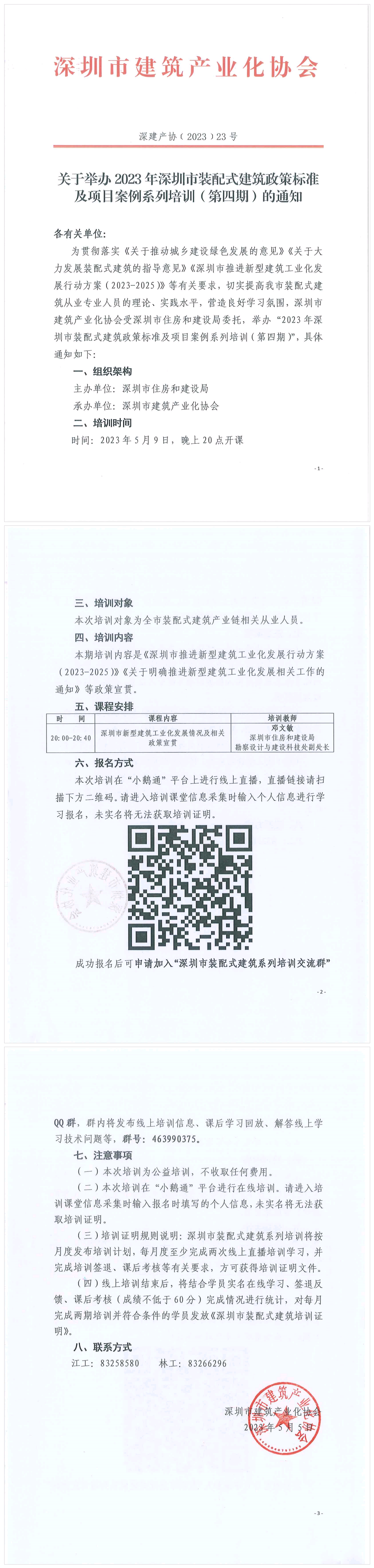 關于舉辦2023年深圳市裝配式建筑政策標準及項目案例系列培訓(第四期)的通知