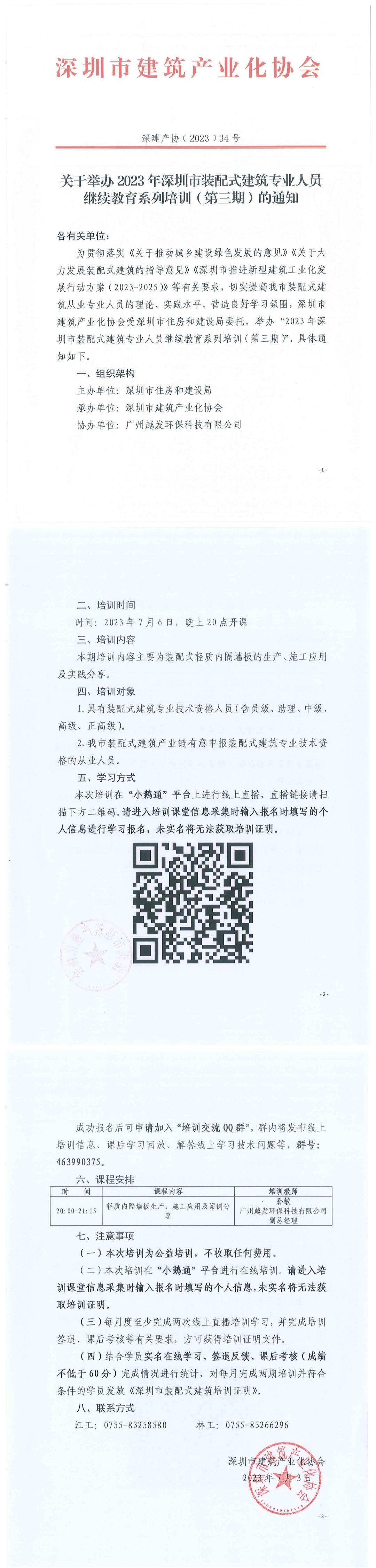 關于舉辦2023年深圳市裝配式建筑專業人員繼續教育系列培訓(第三期)的通知