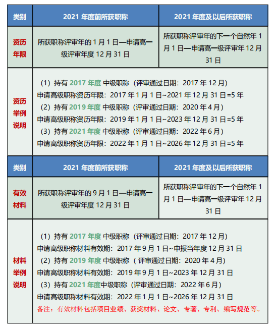 1.對于 2021 年度及以后年度取得職稱的專業技術人才,申報評審高一級職稱時,職稱申報材料時段的起算時間為本級職稱評審年度的下一自然年 1 月 1 日,截止時間為申報高一級職稱評審年度的 12 月 31 日。