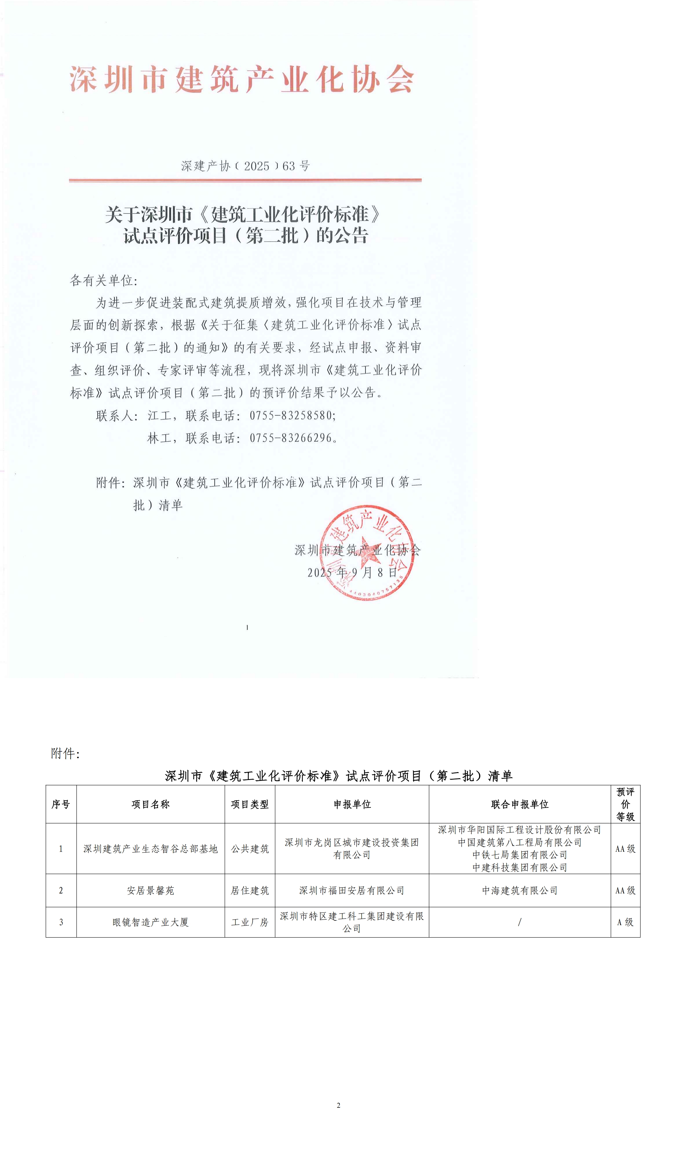 關于深圳市《建筑工業化評價標準》試點評價項目(第二批)的公告