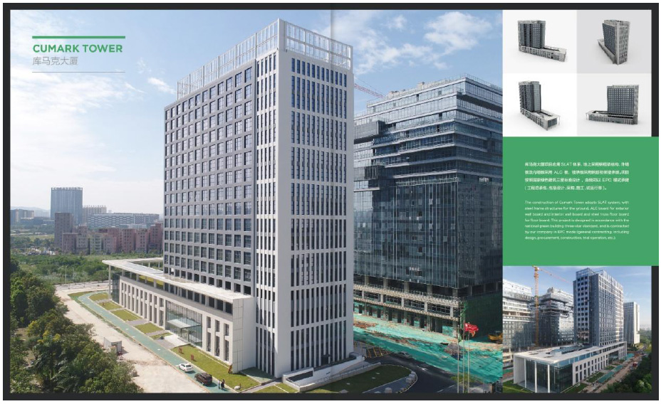 庫馬克大廈位于深圳市光明區技術產業園,總建筑面積 38697m2,地上 17 層,地下 2層,總建筑高度76.4m。庫馬克大廈采用金鑫綠建自主研發的“裝配式鋼結構輕板建筑成套技術體系”設計建造。地上結構采用全鋼結構+鋼筋桁架樓承板+ALC 內外墻板,鋼結構柱采用箱型鋼柱內灌混凝土技術,鋼梁采用 H 型截面鋼材;剪力墻部位采用裝配式斜支撐節點。結構樓板采用鋼筋桁架樓承板組合樓板,免模板、免支撐架施工;建筑外墻、建筑內墻板均采用高溫蒸壓砂加氣混凝土條板(ALC 板),現場外墻采用吊籃施工。